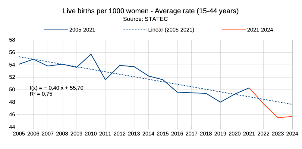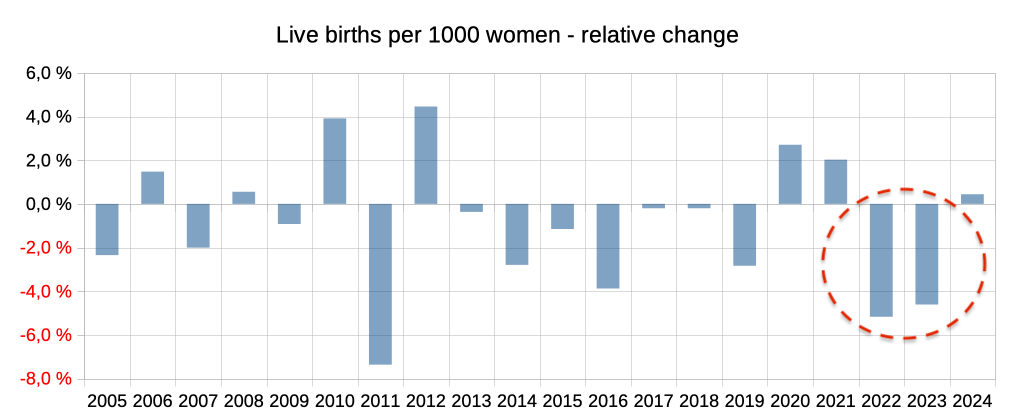 Im Mai erscheinen in der Regel beim STATEC die jährlichen Statistiken des vorangegangenen Jahres. Wir haben daraus eine Graphik der allgemeinen Fertilitätsrate¹ der letzten 20 Jahre erstellt.² Diese Rate beschreibt die Zahl der Lebendgeburten welche im entsprechenden Jahr geboren wurden, pro 1000 Frauen im Alter von 15 bis 44 Jahren. Für die Jahre 2005 bis 2021 (blau) wurde eine lineare Regression durchgeführt, welche den Trend (gestrichelt) beschreiben soll. In guter Näherung fällt für diesen Zeitraum die allgemeine Fertilitätsrate jedes Jahr um 0,4 Lebendgeburten. Die Jahre 2021 bis 2024 sind in orange eingezeichnet. Ab 2022 liegen die Werte deutlich unter der gestrichelten Linie, und damit unter dem Erwartungswert. Allerdings kann nicht mit Sicherheit davon ausgegangen werden, dass der Trend sich entsprechend weiter fortgesetzt hätte. Man kann auch die relative Änderung von einem Jahr zum anderen berechnen, welche sich in prozentualer Schreibweise ausgedrückt als: