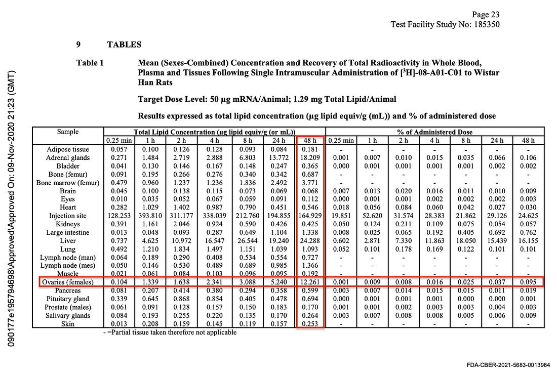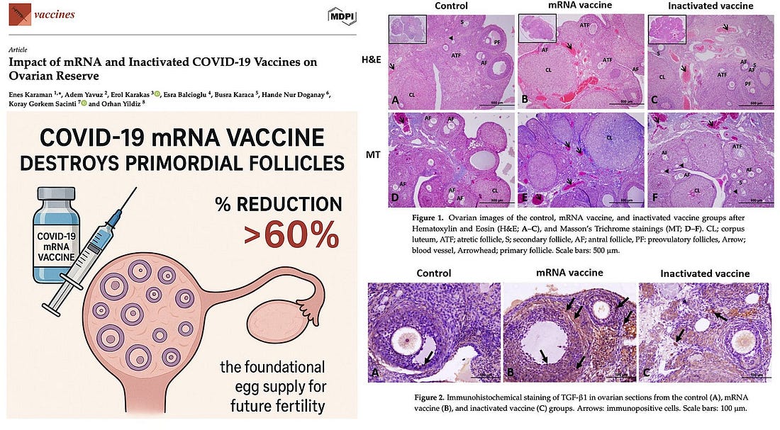 Die Antwort der BiologieWieso Impfstoffe auf modRNA-Basis die Schwangerschaft und damit die Geburtenrate negativ beeinflussen können, ist seit Langem bekannt. Bereits eine Studie von 2011 (!) zeigt die Durchlässigkeit der Plazenta für Lipid-Nanopartikel auf.⁶ Ebenso dass diese Partikel sich im ganzen Körper verteilen und eine Präferenz für die Eierstöcke haben, war in einer freigeklagten Biodistributions-Studie von November 2020 nachgewiesen worden. Sowohl die U.S. Food and Drug Administration (FDA) als auch die European Medicines Agency (EMA) hatten hiervon Kenntnis.⁷ Zwei rezente Studien bestätigen schließlich die bisherigen Feststellungen. In einer Studie von 2024 wird der Nachweis des transplazentalen Übergangs durch Analysen der Plazenta, des mütterlichen Blutes und des Nabelschnurblutes nach der Impfung erbracht.⁸ Dieses Jahr erschien schließlich noch ein Arbeit, welche bei einer Impfung mit mRNA-Vakzinen eine Reduktion der Primordialfollikel feststellte.⁹ Ratten wurden intramuskulär eine Humanäquivalentdosis mRNA gespritzt was daraufhin zu einem Verlust von mehr als 60% ihrer Primordialfollikel führte. Letztere werden vor der Geburt angelegt, können sich nicht regenerieren und bilden die Vorstufe der Eizellen.