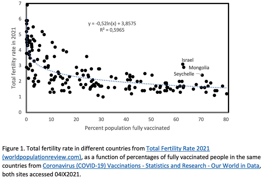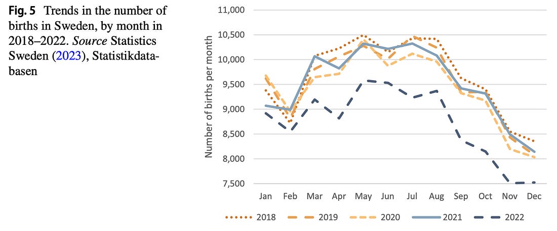 Hier sieht man deutlich, dass in den Jahren 2022 und 2023 die relative Änderung in 2 aufeinanderfolgenden Jahren unter -4 % liegt, eine Beobachtung welche in all den Jahren zuvor nicht festgestellt werden konnte. Wie ist dies zu erklären? Die Antwort der StatistikBereits im September 2021 (!) hatte Hervé Seligmann eine Arbeit auf ResearchGate veröffentlicht, welche eine statistisch signifikante Korrelation zwischen der Gesamtfertilitätsrate und der Impfquote verschiedener Länder identifizieren konnte.³ Dabei wurden auch verschiedene potenzielle Störfaktoren berücksichtigt. Ein Effekt auf die Gesamtfertilitätsrate wurde darüberhinaus nur in Bezug auf die Impfquote der Frauen nachgewiesen, diejenige der Männer spielte in diesem Zusammenhang keine Rolle. Spätere Studien erhärten diesen Verdacht. Eine gemeinsame Publikation des Bundesinstituts für Bevölkerungsforschung und der Universität Stockholmschreibt im Abstract:⁴