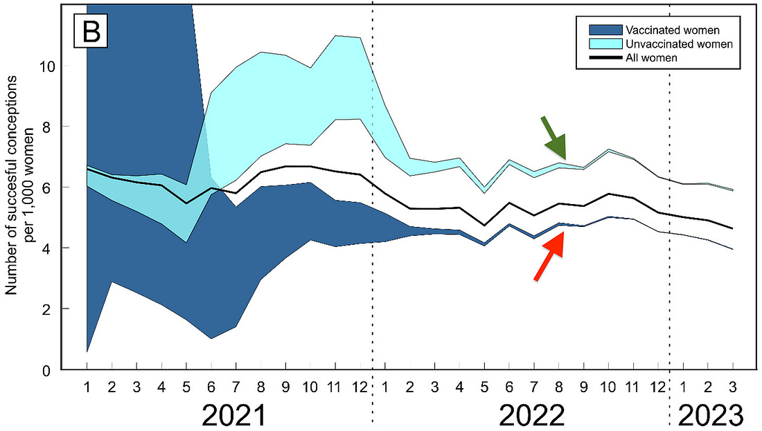 Die so ermittelten 2335 Frauen wurden kontaktiert und zu Nebenwirkungen befragt, die Resultate dieser Umfrage wurden in der folgenden Tabelle veröffentlicht. Da es ja nicht um einen Vergleich zwischen verschiedenen Impfstoffen geht, ist der untere Teil der Tabelle schon mal Makulatur (rot gestrichelter Bereich), oder frei nach Prof. Bude: “es sieht so nach Wissenschaft aus, ne?”.¹⁹ Von den angeschriebenen Frauen antworteten nur 476, was rund einem Fünftel entspricht. Davon meldeten 89 Teilnehmerinnen eine oder mehrere Impfkomplikationen. Ausgewertet durch unsere beiden “Experten” (Zitat) blieben noch 17 Fälle übrig, für welche “ein Zusammenhang mit der Impfung nicht ausgeschlossen werden konnte”. Nach welchen Kriterien diese Selektion stattgefunden hat, ist nicht dokumentiert. Die nicht weiter überraschende Schlussfolgerung attestiert den Impfstoffen ein Nutzen-Risiko-Verhältnis, welches durch diese Nachbeobachtung “nicht kann in Frage gestellt werden”. Die gute Verträglichkeit sei bestätigt worden, die Empfehlungen beruhten auf internationalen Daten, welche im April 2021 zu Verfügung standen. Ein Signal in der Pharmakovigilanz sei durch diese “externe Expertise” (Zitat) nicht festgestellt worden. Ohne Kontrollgruppe, also Vergleichsmöglichkeit, ist diese Studie jedoch wertlos. Für eine objektive Einschätzung der Situation wäre eine Studiendesign notwendig, welches sowohl geimpfte wie auch ungeimpfte Personen einbezieht. Die Frage die am Ende des Tages schließlich zählt: habe ich als Geimpfte eine höhere Chance auf eine erfolgreiche Schwangerschaft? Eine definitive Antwort?Eine Studie welche diese Anforderungen erfüllt wurde am 6. Mai als Preprint veröffentlicht.²⁰ Nationale Geburtsdaten der Tschechischen Republik von 1,3 Millionen Frauen im Alter von 18 bis 39 Jahren waren von Januar 2021 bis Dezember 2023 nach Impfstatus ausgewertet worden. Im Falle einer Lebendgeburt wurde der Status der Mutter 9 Monate zuvor festgestellt und so die entsprechenden monatlichen Raten erfolgreicher Befruchtungen (engl.: successful conceptions, SCs) berechnet. Die folgende Grafik zeigt die beiden Raten für ungeimpfte (grüner Pfeil) und gegen Covid-19 geimpfte Frauen (roter Pfeil). Anfangs gibt es durch die geringe Anzahl an Personen in der jeweiligen Kategorie statistisch noch große Konfidenzintervalle, später konkretisieren sich dann die Werte. Auf der vertikalen Achse ist die Rate erfolgreicher Befruchtungen pro 1000 Frauen eingetragen. Geimpfte Frauen haben somit gegenüber Ungeimpften eine um ca. 33% verringerte Rate. Wie wäre es mit Transparenz?Wie wir gesehen haben, hat Luxemburg ein Impfregister von sehr hoher Qualität, die entsprechenden Daten für eine analoge Studie sind jedenfalls vorhanden und eine vergleichbare Analyse mit wenig Aufwand realisierbar. Eine Offenlegung der anonymisierten Rohdaten, sodass zumindest vom Prinzip her jeder Bürger die Behauptungen verifizieren kann, ist eigentlich das mindeste was man in einer demokratischen Gesellschaft verlangen kann und wäre Voraussetzung für eine längst überfällige Diskussion. Wie die Realität zeigt, würden sich für die tatsächliche Ausführung der Analyse sicher unabhängige Wissenschaftler finden um diese Arbeit zu übernehmen. Die Befriedung einer gespaltenen Gesellschaft ist, unserer bescheidenen Meinung nach, nur mit einer faktenbasierten Aufklärung durch Veröffentlichung aller verfügbaren Daten möglich. 2 Fertility rates by age groups. STATEC. 3 Seligmann, H. Female COVID19 vaccination associates with lower fertility. ResearchGate. September 2021. doi: 10.13140/RG.2.2.21838.59208 4 Bujard, M., Andersson, G. Fertility Declines Near the End of the COVID-19 Pandemic: Evidence of the 2022 Birth Declines in Germany and Sweden. Eur J Population 40, 4 (2024). https://doi.org/10.1007/s10680-023-09689-w 5 Christof Kuhbandner, Klaus Kroy. Kein Kind in der Krippe. Cicero Online. Publiziert am 26.12.2024. https://www.cicero.de/innenpolitik/woher-kommt-der-geburtenrueckgang 6 Kulvietis V, Zalgeviciene V, Didziapetriene J, Rotomskis R. Transport of nanoparticles through the placental barrier. Tohoku J Exp Med. 2011 Dec;225(4):225-34. doi: 10.1620/tjem.225.225. PMID: 22052087. 7 A Tissue Distribution Study of a [3H]-Labelled Lipid Nanoparticle-mRNA Formulation Containing ALC-0315 and ALC-0159 Following Intramuscular Administration in Wistar Han Rats. https://phmpt.org/wp-content/uploads/2022/03/125742_S1_M4_4223_185350.pdf 8 Lin X, Botros B, Hanna M, Gurzenda E, Manzano De Mejia C, Chavez M, Hanna N, Transplacental transmission of the COVID-19 vaccine messenger RNA: evidence from placental, maternal and cord blood analyses postvaccination. American Journal of Obstetrics and Gynecology (2024). doi:10.1016/j.ajog.2024.01.022https://www.ajog.org/article/S0002- 9378(24)00063-2/fulltext 9 Karaman, E.; Yavuz, A.; Karakas, E.; Balcioglu, E.; Karaca, B.; Doganay, H.N.; Sacinti, K.G.; Yildiz, O. Impact of mRNA and Inactivated COVID-19 Vaccines on Ovarian Reserve. Vaccines 2025, 13, 345. https://doi.org/10.3390/vaccines13040345 11 Florian Schilling. Geburtenrückgang und Impfung: mögliche Zusammenhänge. Multipolar-Magazin. Veröffentlicht am 12.07.2023. 12 Sabine Stebel. #Placentagate revisited – Schadmechanismen der Plörre während der Schwangerschaft. DrBines verbales Vitriol. Substack. Veröffentlicht am 20.01.2024. 13 Vaccine Adverse Event Reporting System (VAERS). https://vaers.hhs.gov/ 14 OpenVAERS. https://openvaers.com/ 15 More Proof VAERS Does Not Publish All Legitimate Reports Received! WelcomeTheEagle’s Substack. Veröffentlicht am 13.07.2024. 16 Craig Paardekooper. Deletion of a Crime. How Bad is My Batch. 17 Espace Professionnel > Domaines > COVID-19. Ministère de la Santé et de la Sécurité sociale. https://santesecu.public.lu/fr/espace-professionnel/domaines/covid-19.html 18 Résultats du suivi renforcé de pharmacovigilance des femmes enceintes vaccinées contre la COVID-19 