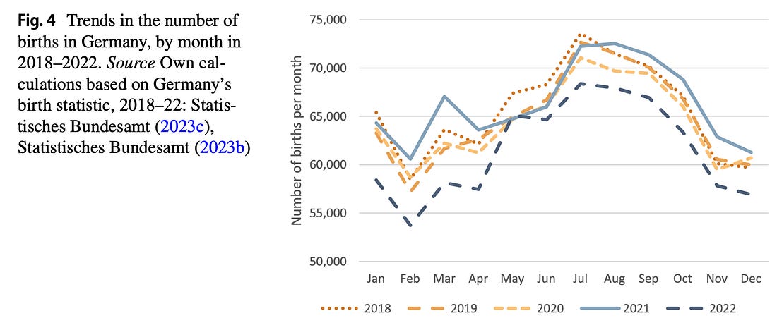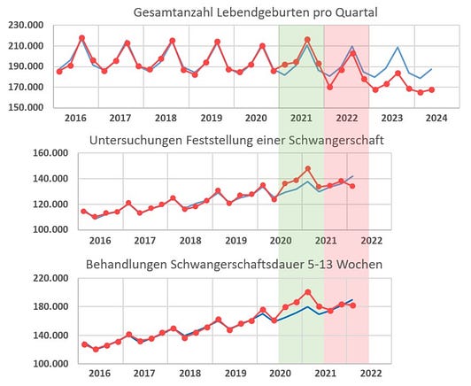 In einer anderen Analyse konnte durch das Einbeziehen von kassenärztlichen Daten die Ursachen noch enger eingekreist werden: es hat somit nicht weniger Schwangerschaften an sich gegeben, jedoch weniger Lebendgeburten.⁵ Die folgende Grafik zeigt von oben nach unten: Lebendgeburten, Schwangerschaften und Behandlungen in der Schwangerschaft. Erstere brechen ab dem ersten Quartal 2022 ein, während die beiden anderen Indikatoren mehr oder weniger dem erwarteten Verlauf folgen. Die Autoren kommen zur Schlussfolgerung: